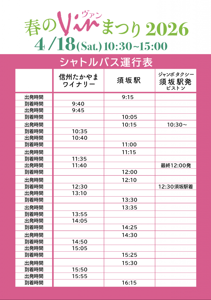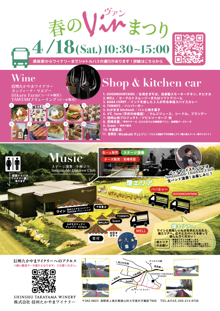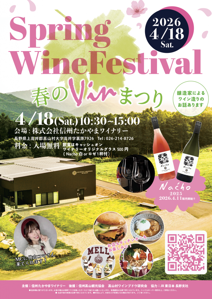 春のVINまつり 2026年4月18日(土) 10時00分~15時 信州たかやまワイナリー周辺にて (〒382-0823 長野県上高井郡高山村大字高井字裏原7926) 今年も須坂駅からシャトルバスあります!シャトルバス運行表は最下部をご覧ください。